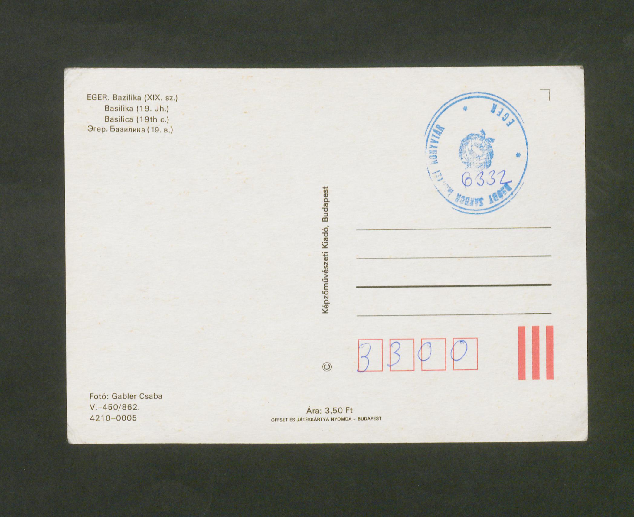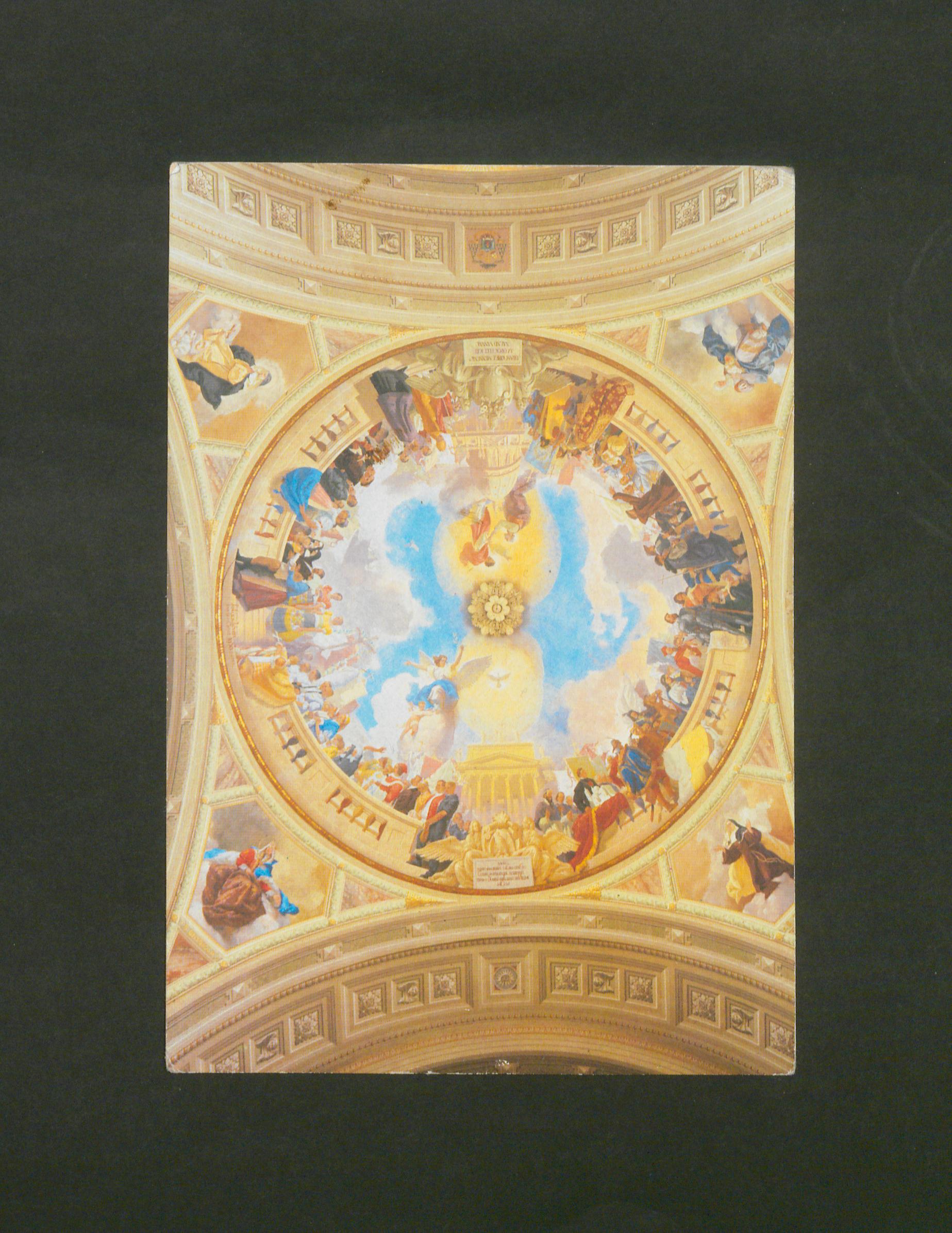 A képeslapon a bejárathoz közeli mennyezetfreskó látható, amelyen az egri bazilika és a római Szent Péter-székesegyház látható történelmi nagyjainkkal és egri egyházfőkkel