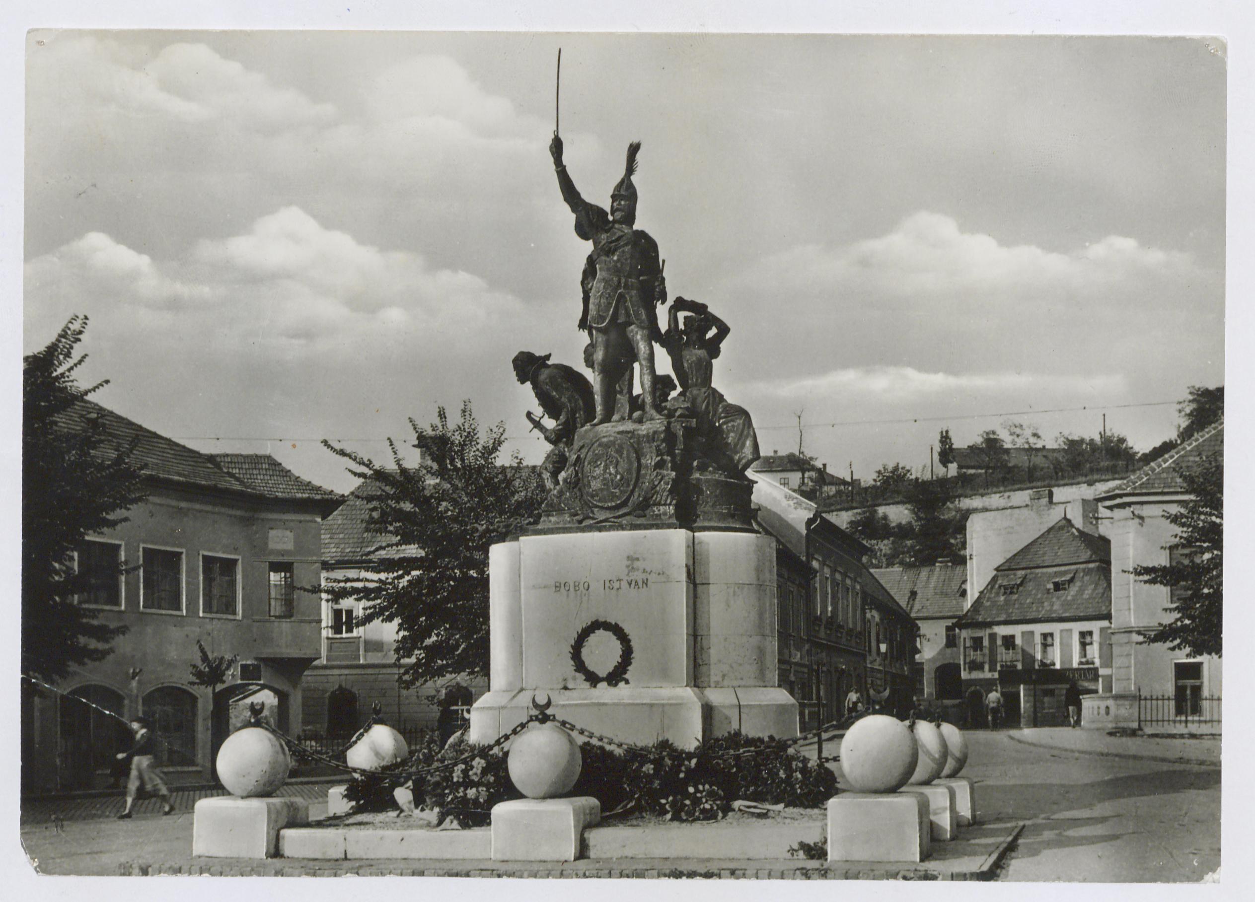 Egy Dobó szobor Egerben torténő felállítására előszor 1882-ben volt kezdeményezés. A városi képviselőtestulet egyhangúlag elfogadta a javaslatot, de az végul nem valósult meg. Tobb hasonló esetet kovetően dr. Kosztler József városi főorvos volt az, akinek a javaslata alapján 1901-ben a városi kozgyűlés 2.000 koronát szavazott meg a szobor koltségeihez. Az alkotás terve 1905 nyarára lett végleges, amelynek alapján Stróbl Alajos szobrászművész elkészítette azt. A felavatására 1907. augusztus 18-án a XVII. Országos Dalos Unnep idején kerult sor.