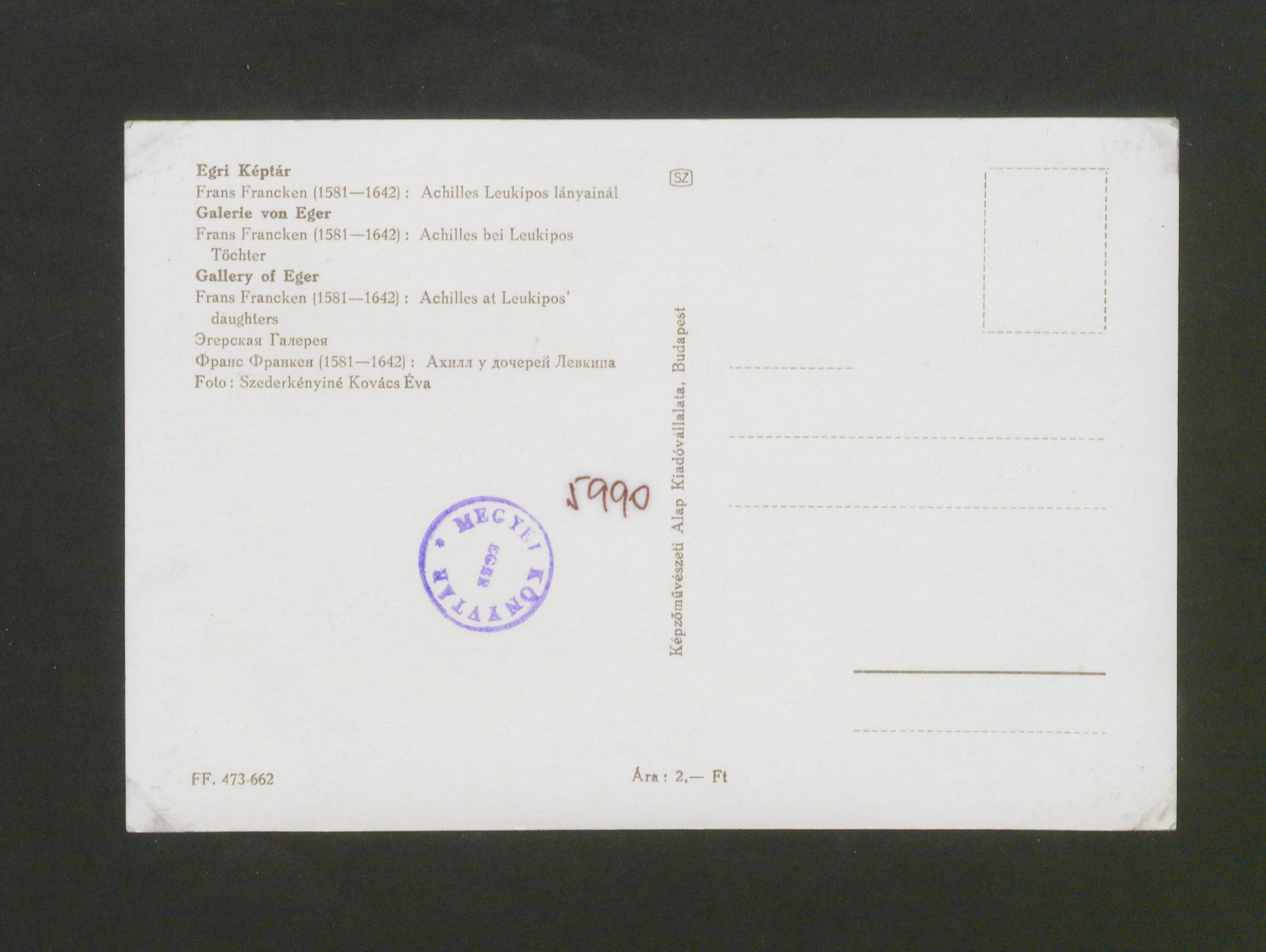 Az egri Érseki Líceum Múzeumát Bartakovics Béla egri érsek alapította 1872-ben, a Líceum 2. emeletének egyik termét jelölte ki "múzeum és képcsarnok" céljára. Eger első múzeuma 1874-től 1944-ig volt látogatható. A képtár gyűjteményébe olajfestmények, szobrászati, grafikai művek, vízfestmények, pasztellek, metszetek stb. tartoztak és ajándékozás, hagyatékozás útján gyarapodott. 1950-ben a Dobó István Vármúzeum kezelésébe került, a tulajdonjog 1992-ben került vissza az érsekséghez. Számos alkotás az 1958-ban megnyílt Egri Képtárban volt kiállítva 2014-ig. Az Egri Képtárban az Érseki Líceum képein kívül helyet kapott néhány a Városházáról a múzeumba került kép, néhány letét a Magyar Nemzeti Galériából, de vásárlás útján is gyarapodott. Az ifjabb Frans Francken flamand festő (1581-1642) Achilles Lykomedes lányainál (olajf. fára, 53x73 cm) kompozíciója több példányban, variációban ismert, egyik a Louvre-ban található. A mitológiai jelenet a Skyros szigetén, Lykomedes királynál lányként bujkáló Achilleust ábrázolja, amint az őt kutató, ravasz Odüsszeusz által hozott pajzsot és kardot felkapja. Bartakovics Béla egri érsek ajándéka.