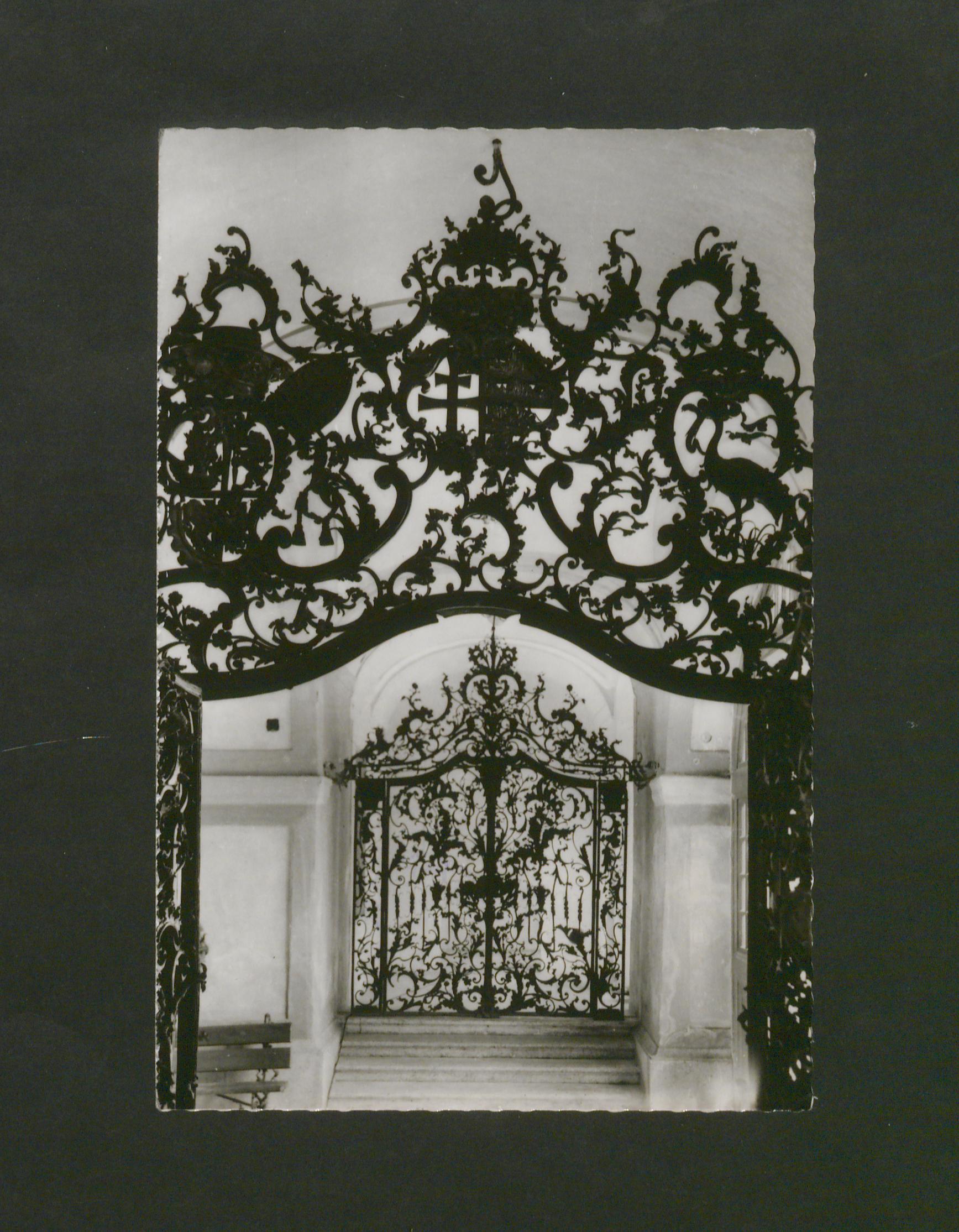 A Kossuth Lajos utca 9. sz. alatt álló Megyeháza épületét díszíti. Fazola Henrik (Würzburg, 1730 - Diósgyőr, 1779) vasműves munkája, akit Barkóczy Ferenc egri püspök hívott Egerbe. A két kapu a rokokó művészet legszebb művei közé tartozik, 1758-1761 között készült. A címeres kapu a jobb oldalon, eredeti helyén áll. A baloldali szőlőfürtös kapu eredetileg a második emeleten, az ülésterem és a lépcsőház között állt. A címeres kapun három címer látható, az első az építtető, Barkóczy Ferencé, a középső az ország, a harmadik pedig Eger címere. A szemközti kapu a szőlőfürtjein, vesszőin, indáin kívül más növényábrázolásokkal is gazdagon díszített. A címeres kapu külön érdekessége a kilincs, ami egy bohócot ábrázol. A főkapu feletti félköríves betétrács díszítés is Fazola Henrik munkája. A díszrácson három aranyozott szobor áll: a Hit, a Remény és az Igazság allegóriái.